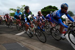 The gun went off and we tore off into the cross wind. Immediately we were going 32 miles an hour. It felt like the start of a crit. Luckily, earlier when we were lining up for the start, I had cut in line and was in the top 20. I fought to keep my good position. We turned a corner and the full force of the wind hit us from the side. The peloton strung out across the road in a horizontal line as everyone tried to hide from the cross wind. A rider a couple bike lengths in front of me collided with another, and almost went down. The guy in front of me swerved to the right, where I was passing people to get closer to the front. We slammed into each other as I locked my breaks up and began skidding. No one went down.