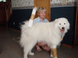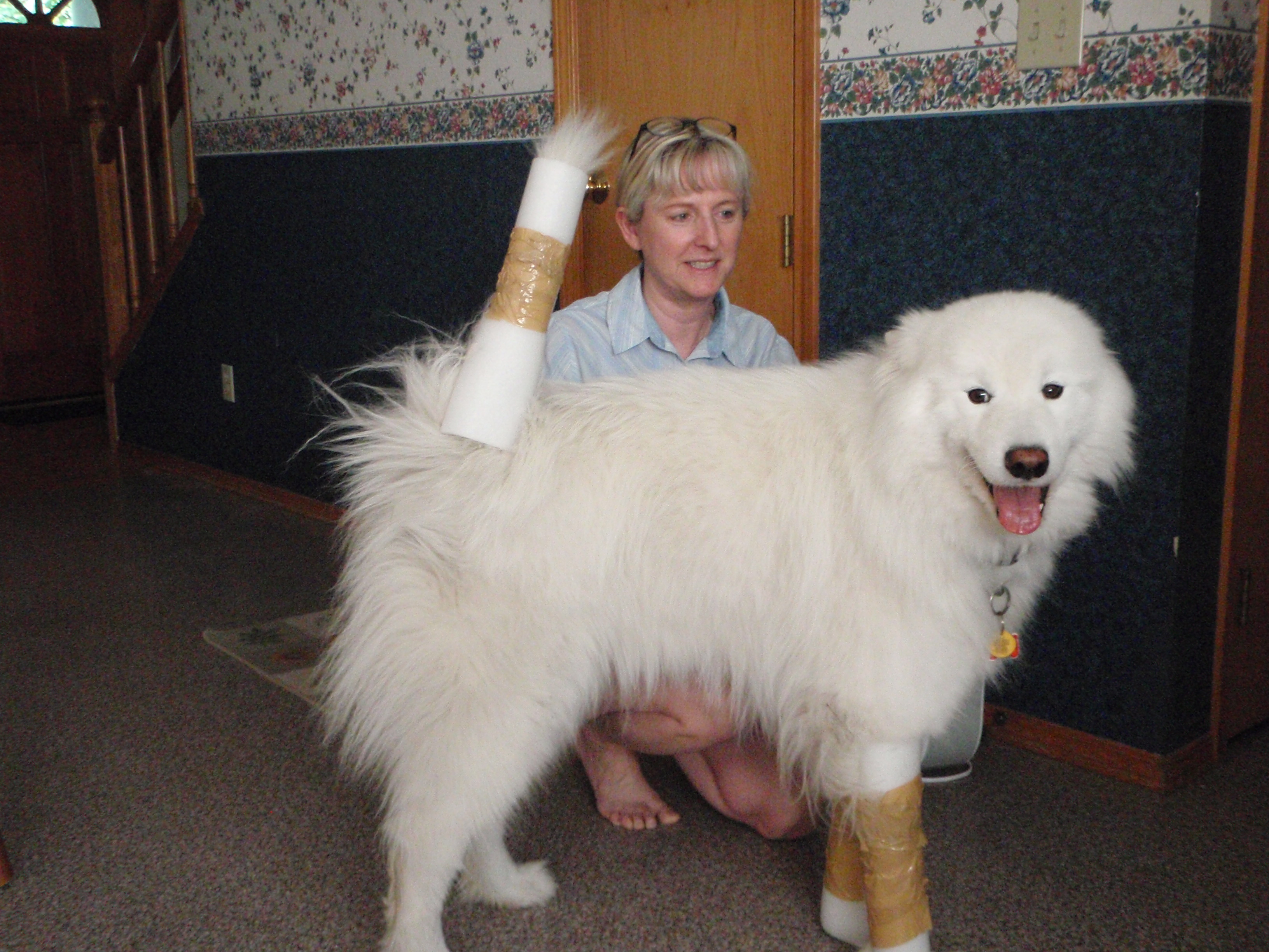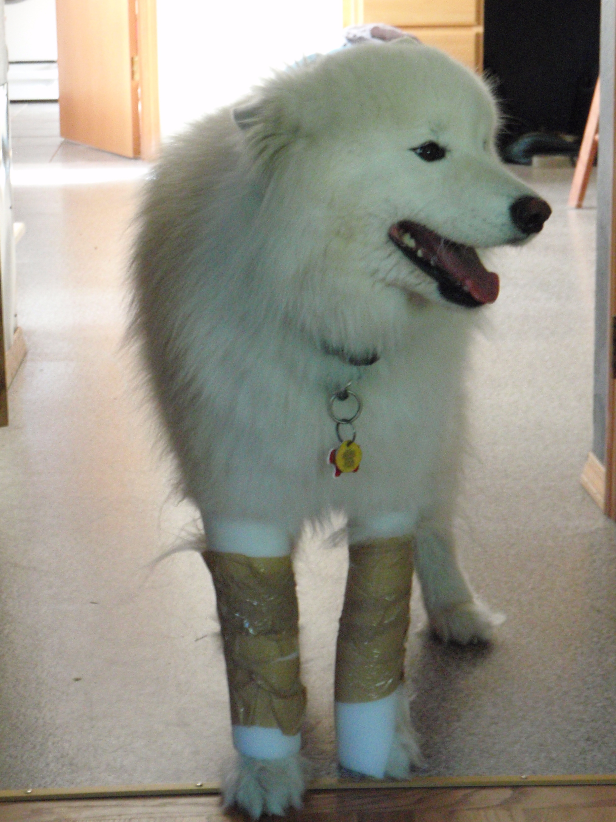 And last but not least. Here’s a photo or two of Thomas with Styrofoam taped around his front legs and tail. He was no pleased with this. Later in the day, he got back at me by biting me in the groin while I was throwing small apples in the backyard at him and Galen.