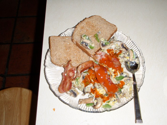 His presentation of the food in this post modern world is representative societies opinions of the moral code we try to live by. Ya, he’s got a pretty plain meal, but it’s just messy enough to say: Fuck the Man; I don’t care that I’m eating an inferior breakfast compared to my house-mate, due to his flamboyant use of mushrooms and Rouge bell-peppers. Chris is being a real original by ignoring the urge to be different and make disgusting looking (yet tasty!)food. Whereas you, kennett, are as original as your macbook and ipod. O ya, and those jean shorts. Way to copy me. asshole.