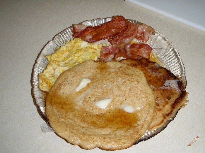 3 eggs, 1 and a half Bob’s Red Mill 7-grain pancakes (I had the other half), 3 pieces of bacon, butter, maples syrup.