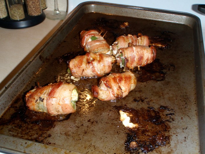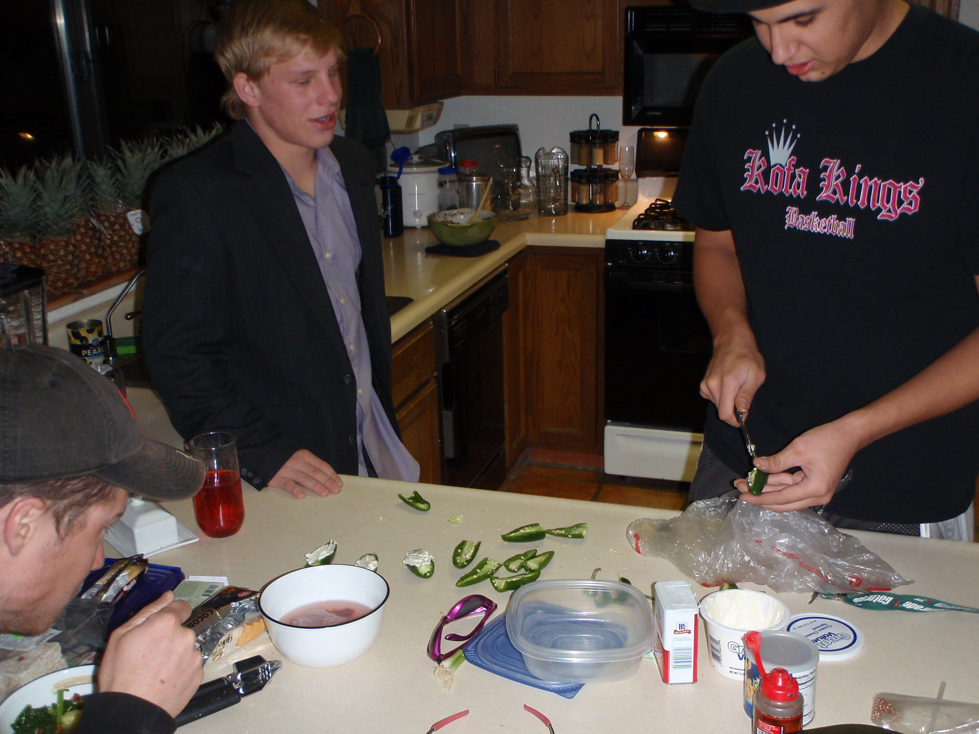Preparing the feast. Over the course of about five hours, we caught two doves and a quail. Mark is on the left. Anthony, a friend of his came over to help make the bird meat jalapeno poppers. Ingredients: jalapenos, cream cheese, dove or quail breast, bacon.