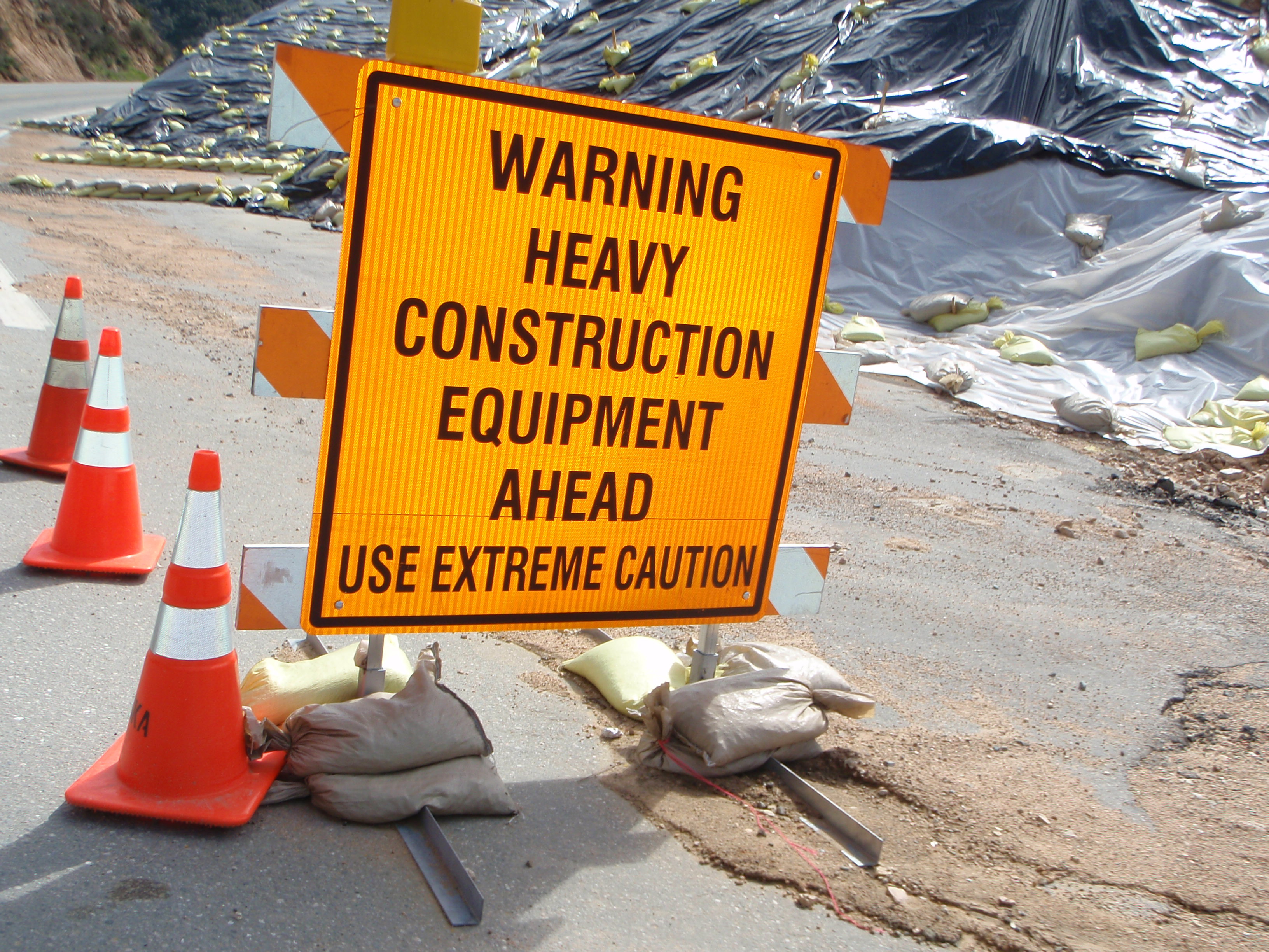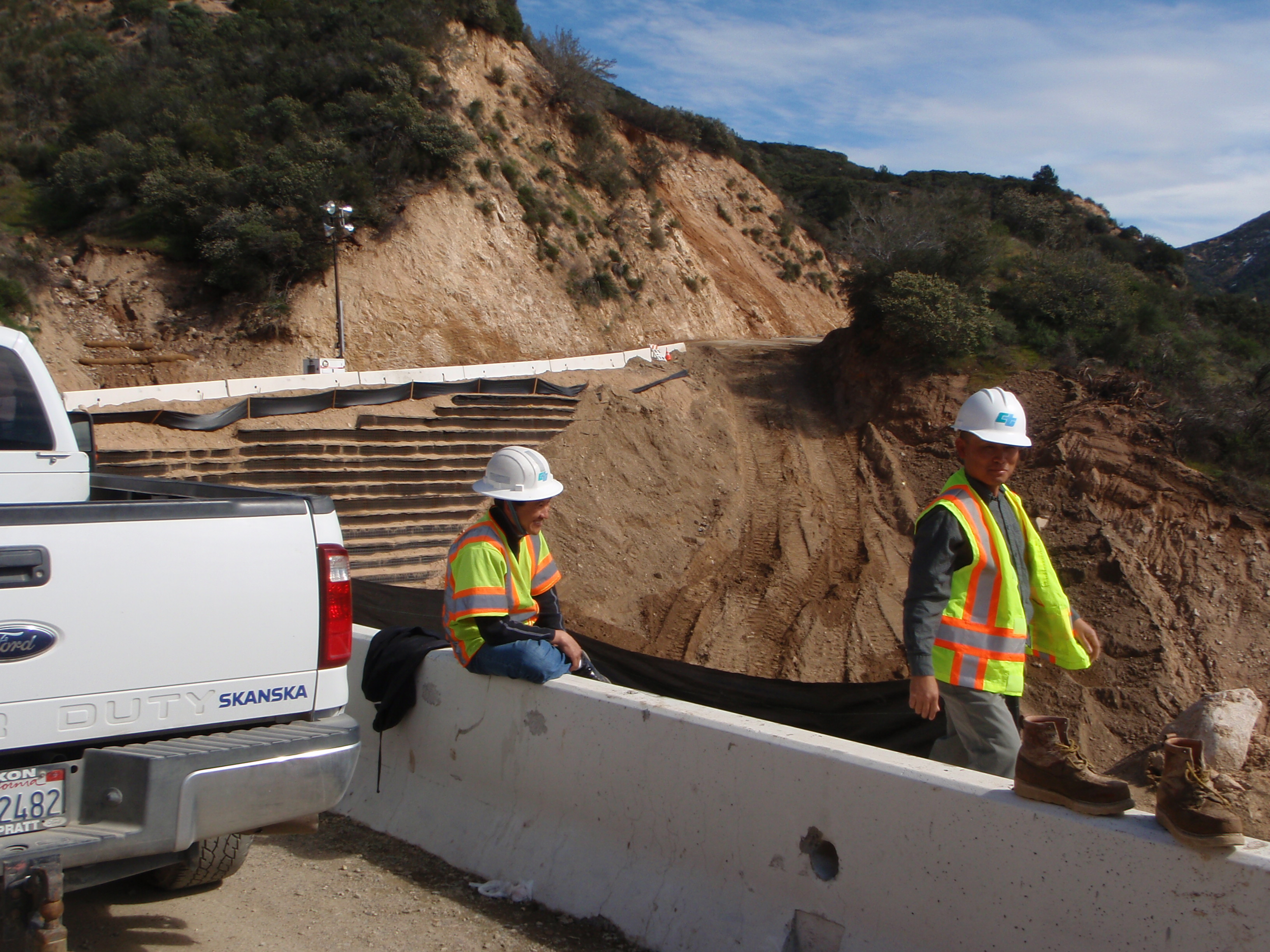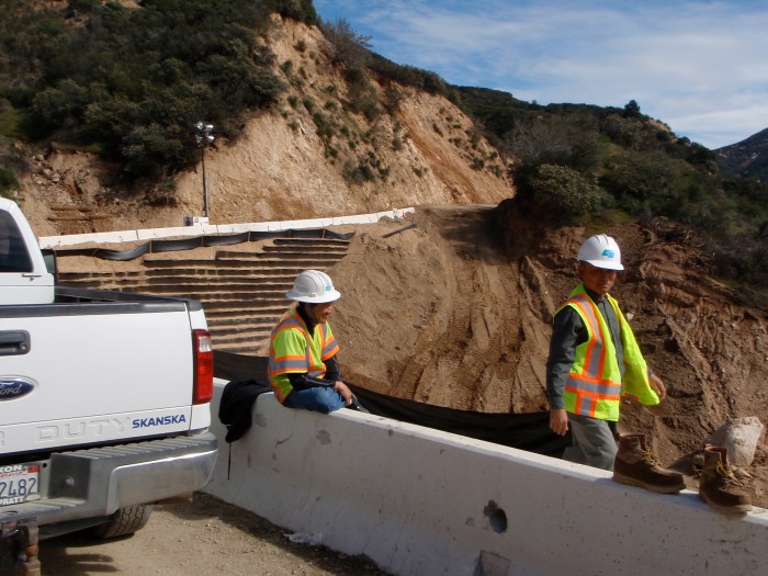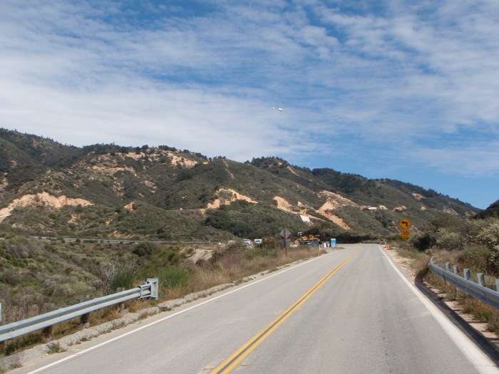 Unfortunately, I was stopped before I even got to the land slide area, where there’s a little lip of pavement left that I heard on the internet and also from word of mouth that you might be able to skirt by on.  There was no chance of this, since there were way too many construction workers up there.