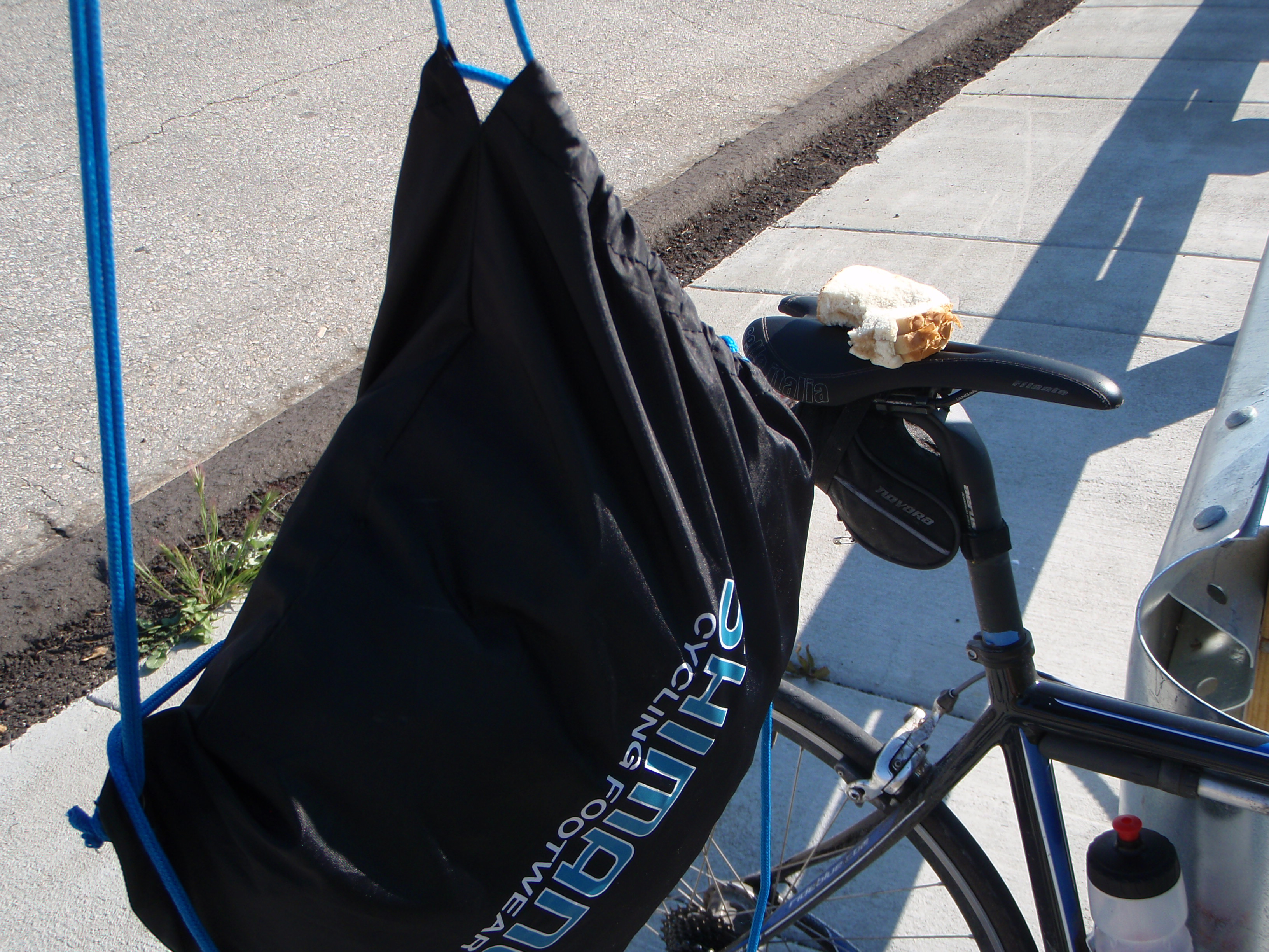 You might be wondering how I tote all my extra warm clothes and food around.  After all, it was 70 degrees down in the valley and just above freezing up above on the mountain (in the evening).  So here’s the answer: a tote bag!  These shoe bags are completely kick butt.  Thanks to Ryan Gielow, I’m now the proud owner of not one, not two, but THREE of these Shimano shoe bags.  My goal is to have one for every day of the week.  (Note: sandwich placement is not optimal, especially after a sweaty three hours in the saddle).