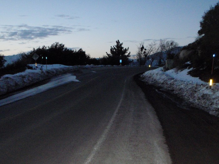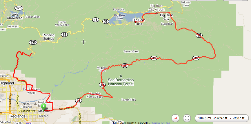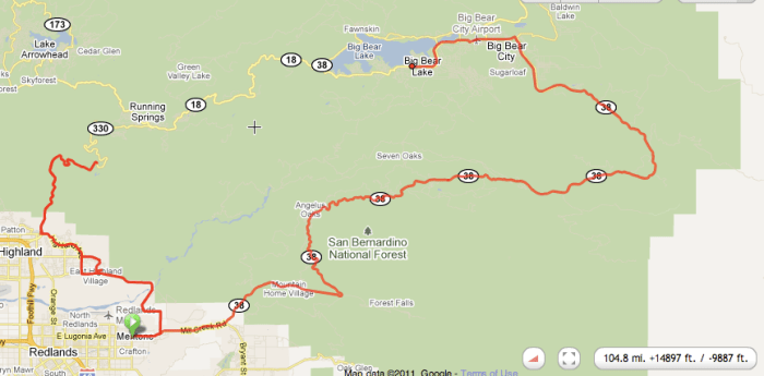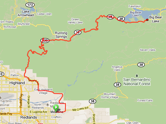 After driving down from Big Bear, Spencer and Karol-Ann and I parted ways, with me doing my own ride.  I planned on riding up highway 330, which is closed to traffic due to a landslide taking out a huge section of road earlier this fall.  I’ve been hearing rumors that you can ride up it for a peaceful, car-less 10 miles or so until you reach highway 18.  From there I would ride the rest of the way back up to Big Bear, about another 15 miles of climbing with some flat and descending sections too.  Nothing too bad.  Here’s what that ride would have looked like: