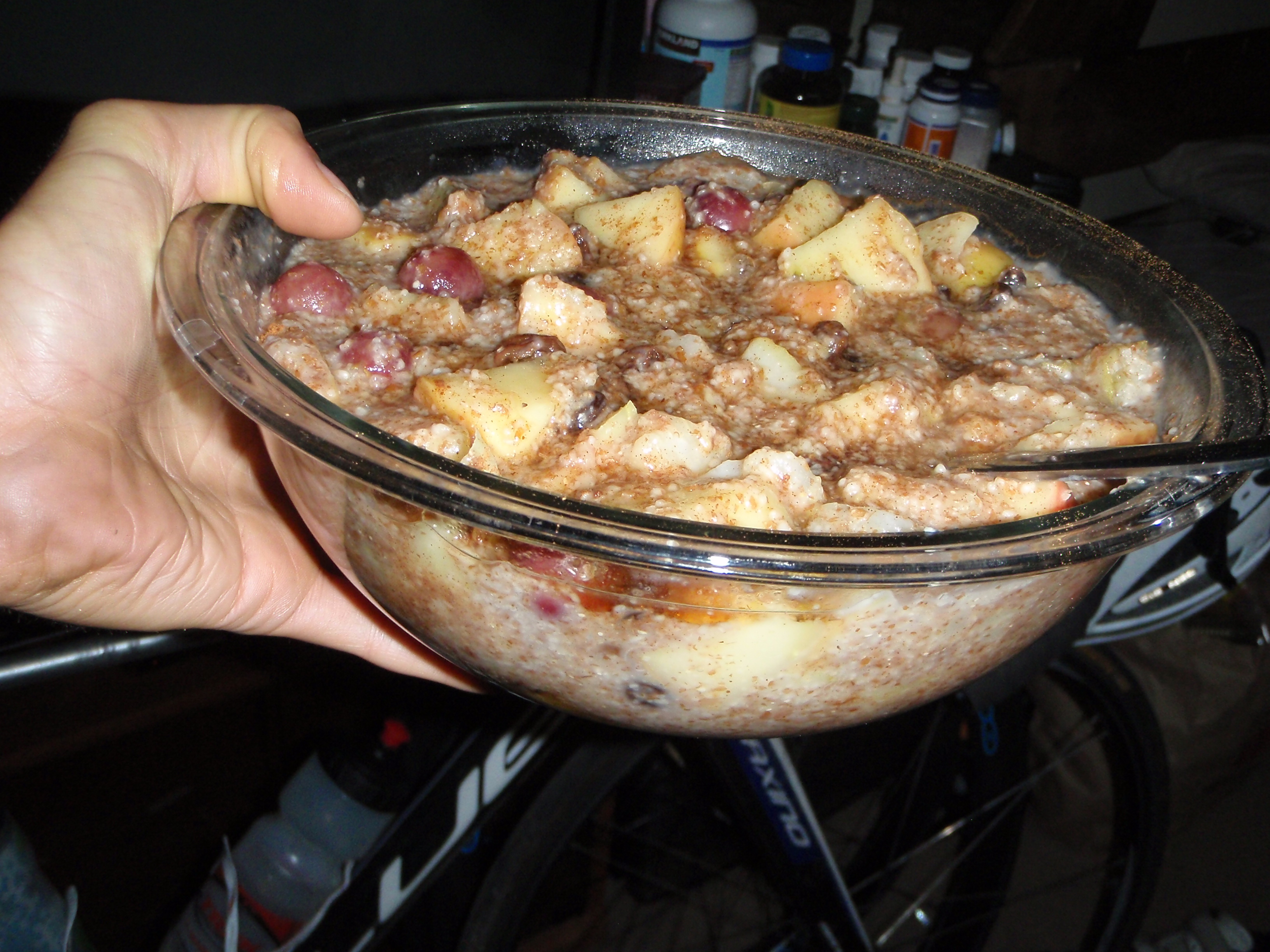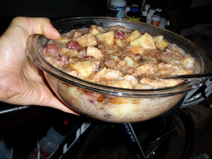 Note the elevation gain down at the right hand corner.  I felt like I was climbing forever, especially since it was pitch black out and I couldn’t see a thing except for the stars and the reflectors on the road.  There was very little traffic during the last hour of climbing, and the flashing of my front strobe light (which Spencer loaned me just in case highway 330 didn’t work) kept me in a rave-like trance.  Despite the cold mountain air and snow on the sides of the road, I stayed warm.  After all, I’d eaten about 3,000 calories of almost pure sugar at that point.  But with just a little bit of climbing to go, the apple pie in my backpack began calling to me.  It had been smashed in my bag, and its gooey, sweet, sweet inards had been released from the delicate flakey crust, coating the inside of the package and making it super sticky to eat.  I devoured it, eyes closed in the dark night, and licked the package and my gloves clean of the apple filling goodness in such bliss, two shooting stars up above stopped to gaze in awe.  Dear Lord of the packaged pie, please give me the strength to continue to ride hard and ride long, for my human body does not poses the greatness which the task at hand demands.  Please, oh Heavenly Apple Pie Father, bless upon me the courage to climb these last 1,400 feet and then firmly grip the brakes during my half hour descent into town, so that I may live to ride another day.  The pie prayer saved me once again and gave me super-human strength to climb the last little bit of the mountain and ride home without even the slightest inkling of a bonk.  Without the pie, though, the last hour of the ride would have been slightly miserable, since all I had left at that point was a small package of sour gummy bears.  Sour gummy bears, though delicious, can never take the place of a Hostess Apple Pie.  In fact, the pie was so fulfilling, I didn’t even need those damn gummy bears.  I got home at 8:10 PM after six hours and forty-five minutes of riding, having burned 5,700 kilojouls.  I downed a big fruit smoothie while I sat in an ice bath, then made a huge bowl of oats and cooked fruit to take in the bath (this time a hot bath).  There’s no better way to end a ride like this than soaking in a hot bath with a huge bowl of oatmeal.  Except, maybe if that oatmeal was cheese cake or pizza instead of oats and fruit.  Or if the bath water was chocolate creme instead of water.  But that’s only for the pros (so I’ve heard), us amateurs have to be happy with regular old bath water and oatmeal.