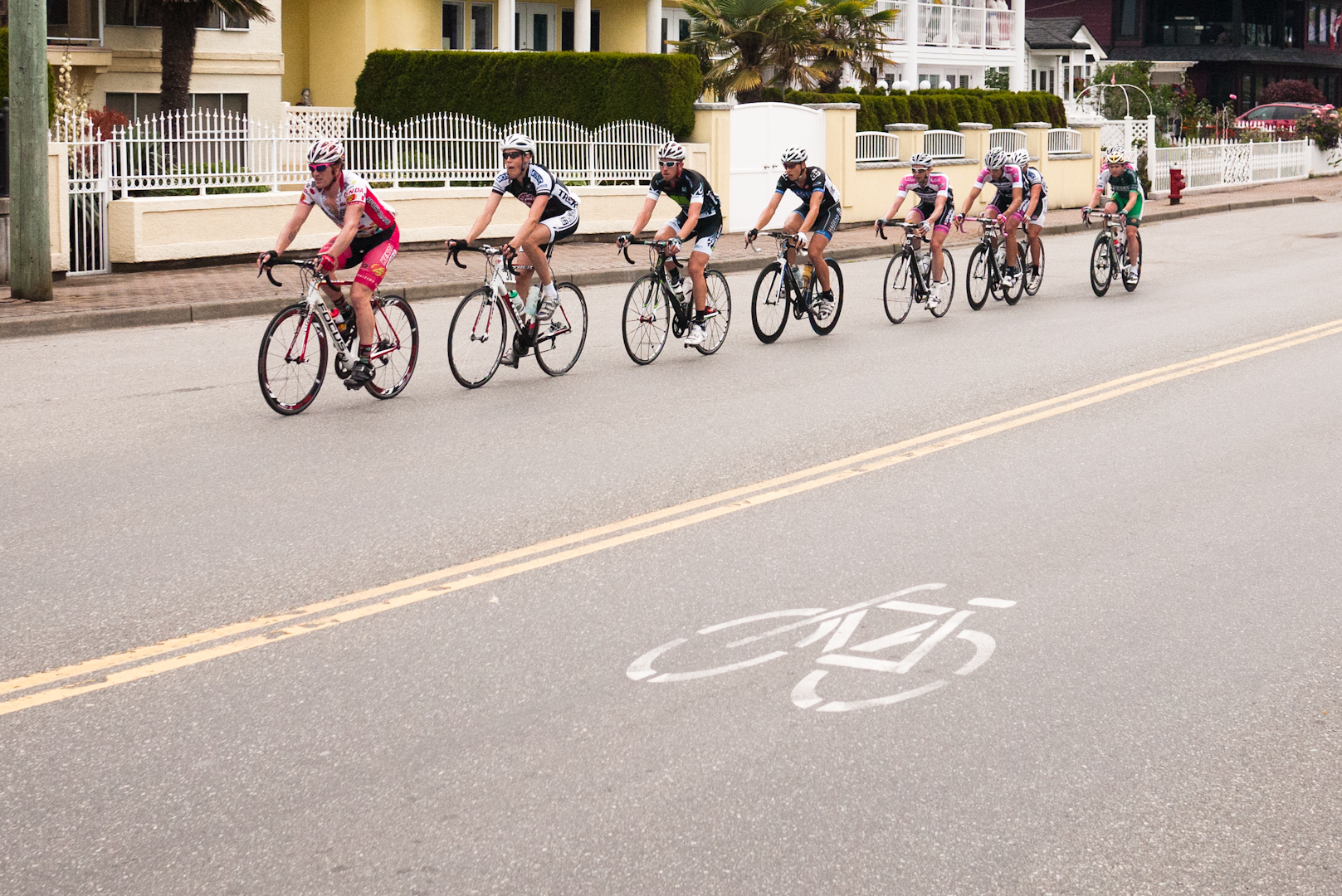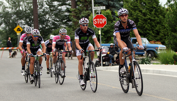 Mid way through the race H&R Block’s star rider Sebastian Salas bridged across to us from the diminished field…solo. Making up a minute gap. A few laps later he blew the breakaway apart and we were down to six guys heading into the short laps: Tim Abrecrombie and Jason Thompson (Louis Garneau), David Vukets (Red Truck), Brad Huff (Jelly Belly), Sebastain Salas (H&R BLock) and myself. Here it began to get tricky. Louis Garneau had two guys at this point, while the other four of us were teammateless in the break. We had 2.5 minutes on the chasers, so there was plenty of time to play cat and mouse. A $50 dollar gift certificate for the first person to cross the line with 5 laps to go persuaded us to sit up and stare at each other even more. I couldn’t help but wonder if the gift certificates were for one of the many fine ice cream establishments in White Rock along the beach front. I’d been salivating over those ice cream shops for the past couple days, dreaming of Rocky Road and fudge swirl. I didn’t contest the prime sprint though, and instead counter attacked right past the finish line to see if I could sneak away. Didn’t work.