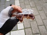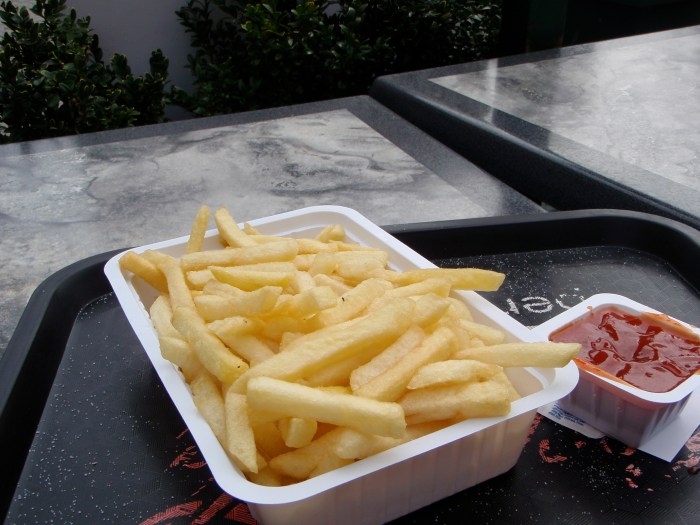 After nearly an hour of starving to death and growing severely weak, we finally bought food. Friets groot. (large).