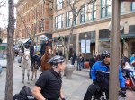 I found the Chipotle and ate my GIGANTIC burrito inside in the warmth of the bustling restaurant.  There must have been 100 people in there, almost as much as the Occupy rally.  I was almost done with it when I saw a crowd and a thousand or so police cars, bikes, horses, and motorcycles come down the street just past the Chipotle.  Perfect, the rally had followed me.  I ran outside, got my bike, and crammed the rest of the delicious burrito down while I caught up to the protesters.  The size of the group had grown ten or twenty fold in the last half hour and now there were well over 1,000 people all chanting, yelling, talking, laughing, and carrying signs.  It was pretty cool.  But the amount of police was staggering.  Simply ridiculous.  To me it was obvious that they were there in an attempt to antagonize, humiliate, and scare the protesters.  Their presence was nothing more than intimidation, sent from Wall Street itself.  If you think we live in a free society, think again.  Yes we do have it better than a lot of other places, but by no means are we a free democratic society.  And free speech does not exist here.  Just spend some time searching for recent police brutality on youtube if you don’t believe it.  The way the news portrays the protesters is sickeningly corrupt.  Corporate news is a means to distract the populace so nothing gets accomplished in government and the corporations who own the media, government (and police)  continue to get exactly what they want.