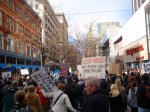 Over four hours of ride time plus a couple hours standing around in the cold I was a hungry Kennett.  I had no food at home so I went straight to Safeway (passing by the eco and socialy friendly co-op for the cheap food of an evil corporation–yes I see the irony).  But I ate plenty of “free sample” bulk food to make up for it.  And, as a gift for my protesting, the gods sent me two more strangers to help me out.  One guy loaded all my food from my cart onto the conveyor belt in the checkout line while I was absent searching for some lotion.  (The exact opposite thing had happened in Belgium a month ago when a guy moved my cart out of the way and took my spot in line.  I had to physicall push his cart out of the way to get my stolen spot back).