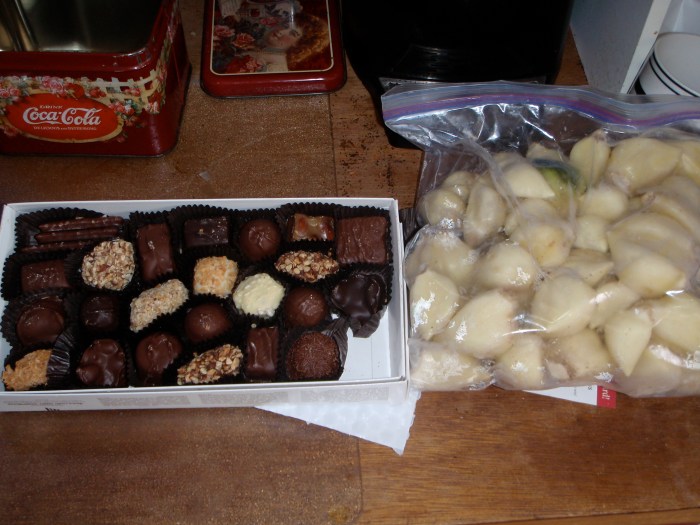 Hard neck garlic and chocolates (pre-vegan). After eating the entire 1-pound box in a sitting, I had to ride downtown and find a homeless man to unload the other box of chocolates on before I finished them off too. I have very limited self-control.