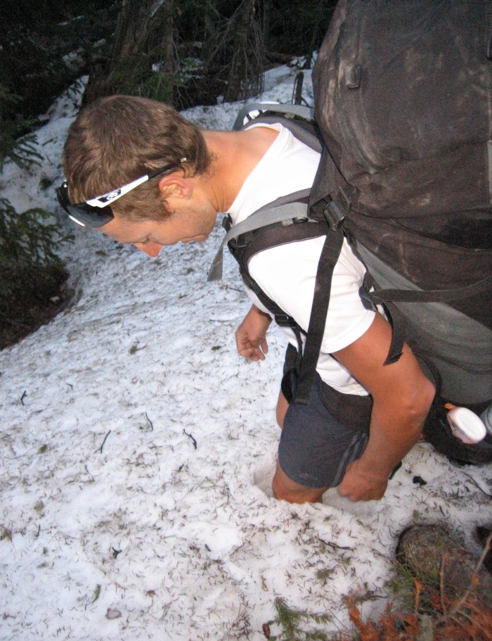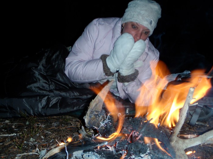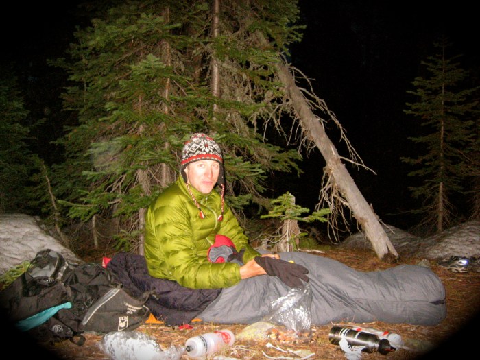 After walking around for one hour trying to find a spot that was level and didn’t have any snow, we found our camp site near a lake. And then it got cold. And then I got hungry. And then I cursed Kim for forgetting the damn cracker trail mix!
