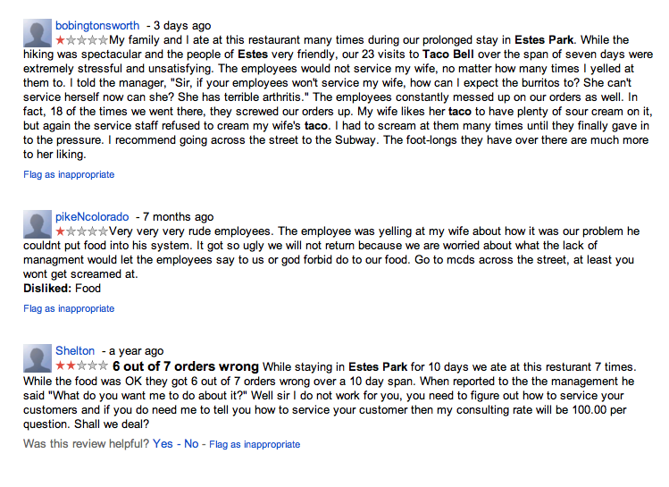 This Taco bell has certainly had some upset customers too. Before the ride I googled it to find out where it was. My only complaint was that they had the hot sauce behind the counter and you had to ask for it, and I had to ask three time for the guy working there to give me enough fire sauce. But here’s the google reviews. Not pretty!