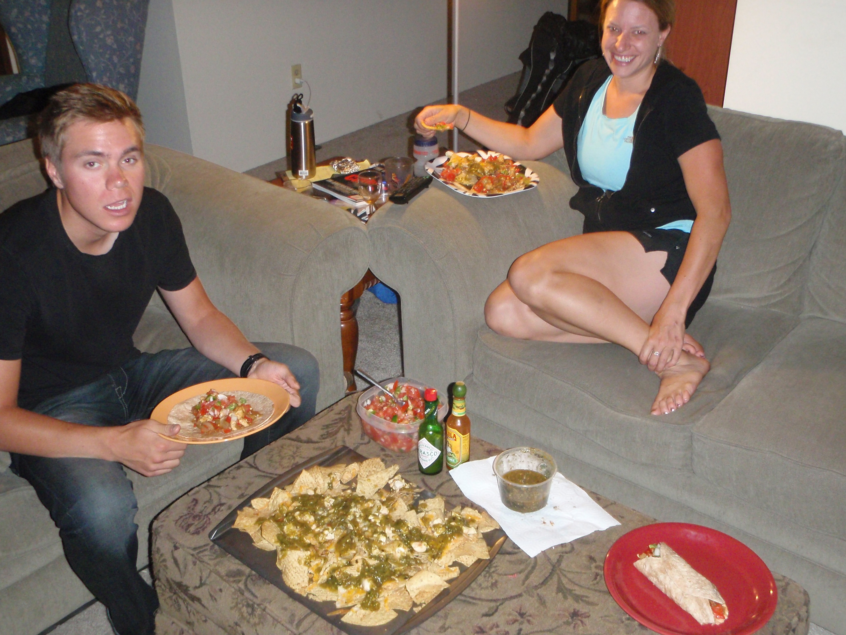 Spencer in a daze from so much good food. Nachos: chips, cheese, garlic, (LOTS of garlic), chicken, chili verde salsa, pico de gallo. Fajitas: mix of bell peppers, onion, chicken, beans, avacado.