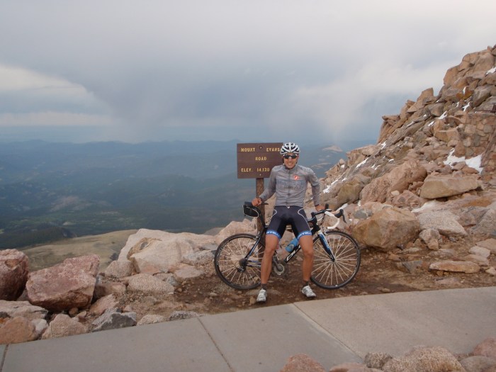Sunday: my last day of training before rest. Today was a day of days. A ride of rides. A man’s man’s ride. A day I’d been looking forward to for a week. Geoff, Kim, and I drove to Golden, the city just south of Boulder. We parked in a Safeway parking lot (a “car park” for you UK readers) and I began my long journey to the top of Mt. Evans while Kim and Geoff did their own rides and runs (triathletes like to run after their rides for some reason. Sounds painful to me). On my ride, I saw six foxes, four deer, an elk, and some long boarders who almost crashed into a car behind me. I reached the summit of Mt. Evans at 14,130 feet elevation some five hours later, having climbed 26,500 feet in the past two days alone. I was wrecked! The last 14.5 miles of the ride go up Mt. Evans itself, starting at the base near 10K feet where it’s still warm and green with trees. Pretty suddenly, near 12K feet, it turns to cliffs, rock, and snow with marmots as your only friends in sight, chattering in earnest for your success to the top…or for you to throw them a peanut. The road is single lane, full of bumps and potholes without a guardrail to keep you from veering of the 500-foot cliff to the left. The last couple miles are all super tight switch back. The wind picked up and I began getting cold despite the hard effort I was putting out. Wait, maybe I wasn’t putting out a hard effort any more. My power meter read low zone 2. I hammered and got it back to zone 3. Not for long. My legs were depleted and rubbery. I got to the top, slightly dizzy and fully gassed. It was snowing lightly and cold. A few people in cars in the car park at the top offered congratulations and a seat in their car to warm up. I declined, stupidly. This is probably where the cold viruses within me came out of hibernation and made their move. Geoff and Kim met me with the car 20 minutes later and we drove a long, long way home to more nachos and a half bag of Cheerios that weren’t mine. I didn’t get to bed until 1:30.