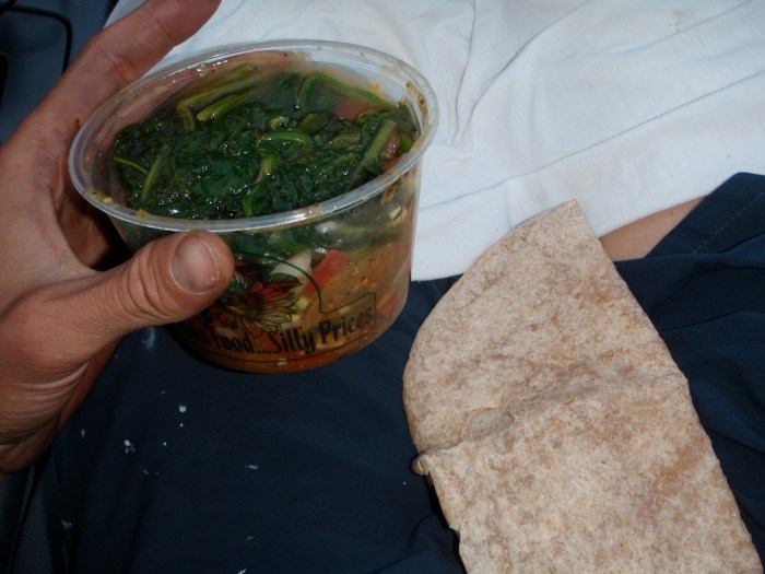 While Kim and Geoff hiked up to the very tip top of Evans, I sat in the car and tried to warm up with this food I’d brought from home. Wanting to raise my burrito count by one, I pounded this cup of spinach and onions with this tortilla and had an extremely sick stomach down the steep road for the next hour and a half. One full bunch of spinach cooks down pretty small, but it’s still too big for a stomach with post ride trauma at altitude.