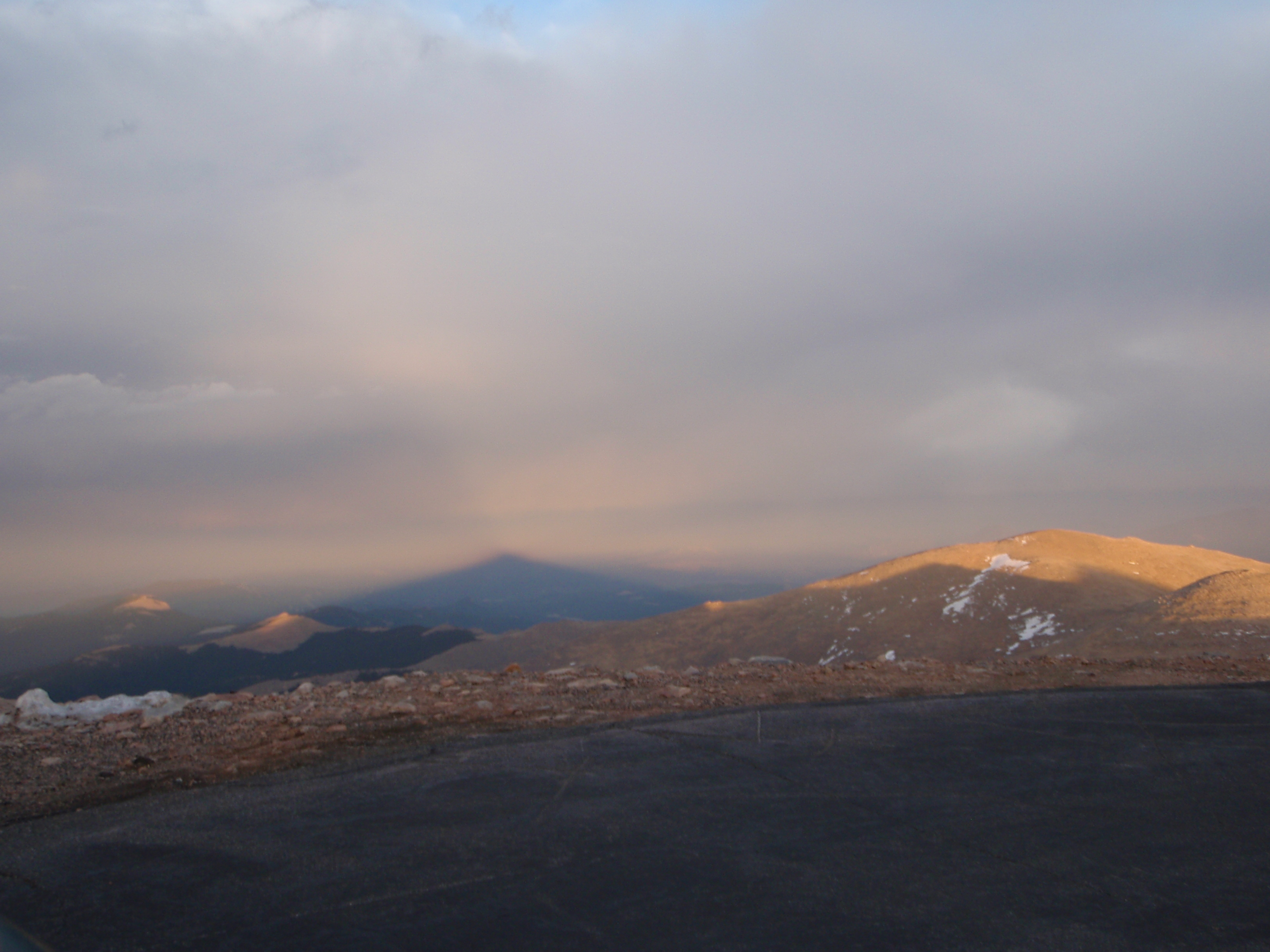 The shadow of Mt. Evans on the drive down. (Note: the mountain is behind us, which is why the shadow is in front of us–because the sun is behind the mountain).