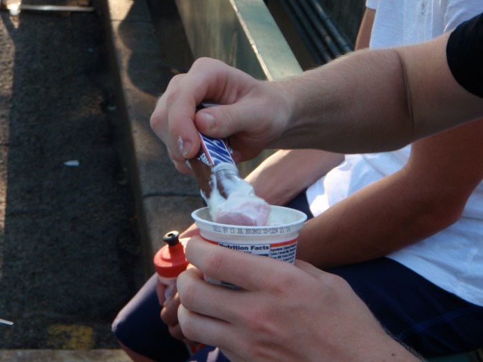 The next day was a long one. Spencer and I went out in the heat for a three hour ride, during which I crushed some vo2 intervals and 10×30 second sprints. I was pretty wrecked after the ride, but there wasn’t much time for rest. Spencer and I quickly ate some frozen yogurt Kim brought home for us, then rode off to my painting job. I’d spent approximately 13 hours over the span of nine trips to Home Depot gathering the few essentials I needed to paint the small garage and dropped it all off at the house a few days before. We rode up to north Boulder in a strong head wind, the sun beating down, drenched in sweat once again. I’d never painted drywall before, and didn’t realize how much sanding is required. Soon we were drenched in sweat and covered in itchy paint from the sanding of the drywall. We had to close the garage door in order to sand the section that the garage door covered on the ceiling. The temperature reached 100 degrees or so and the white paint dust seeped into every pore, our eyes, our noses, our ears, and worked their way through our masks into our mouthes and lungs. We opened the garage door and went out for air, sucking in the relatively cool and fresh air outside in big gulps. Next up was priming, which wasn’t nearly as difficult. We painted until we ran out of paint, then made a mad dash on our bikes back home to meet friends for White Russians and a night out on the town, my first night out since New Year’s Eve.