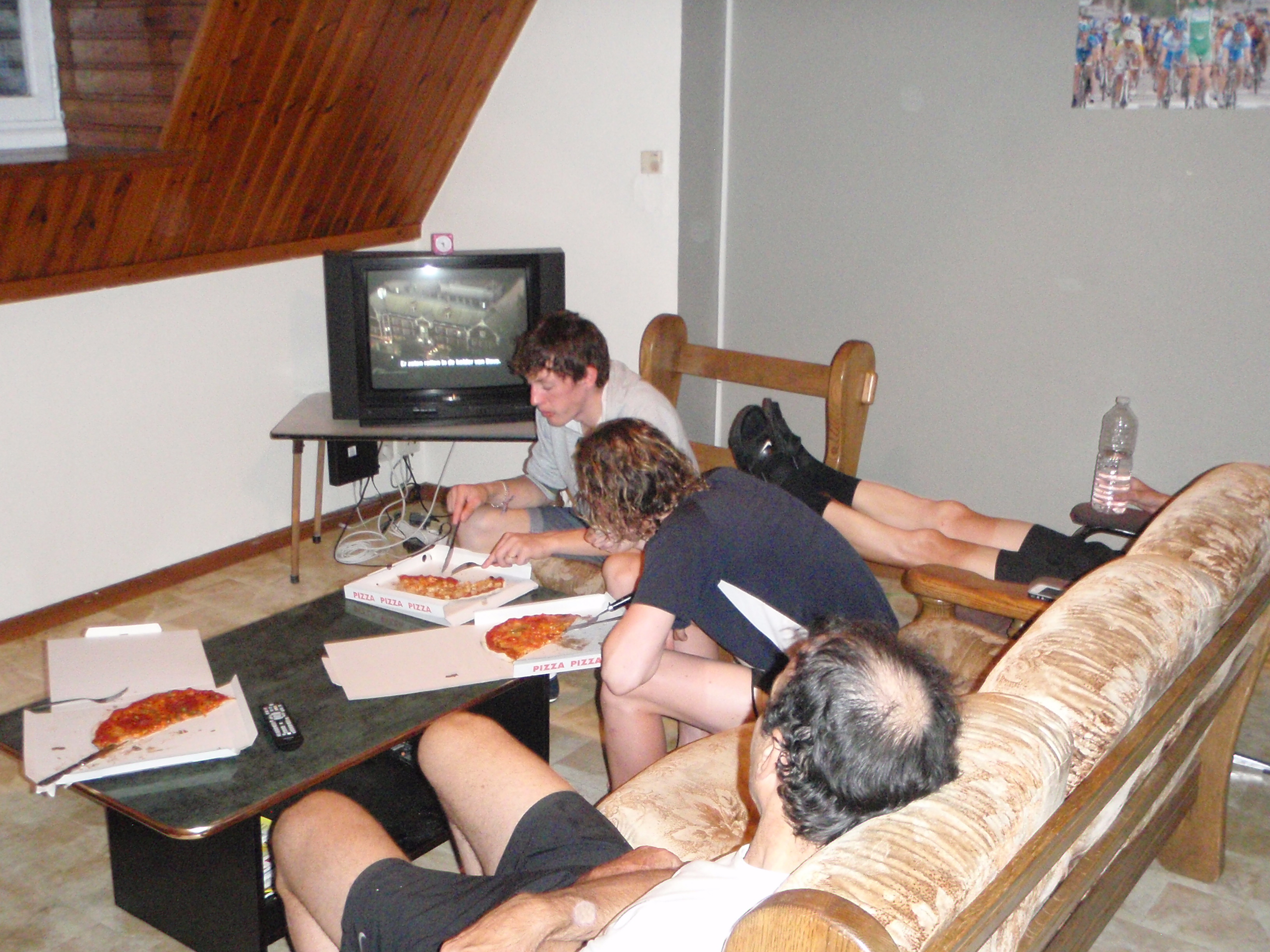 After a big day of racing and riding, Geoff Hawksworth, Evgenye, Justin and Michael (the Greek) spoil ourselves with some over-priced pizza from downstairs.