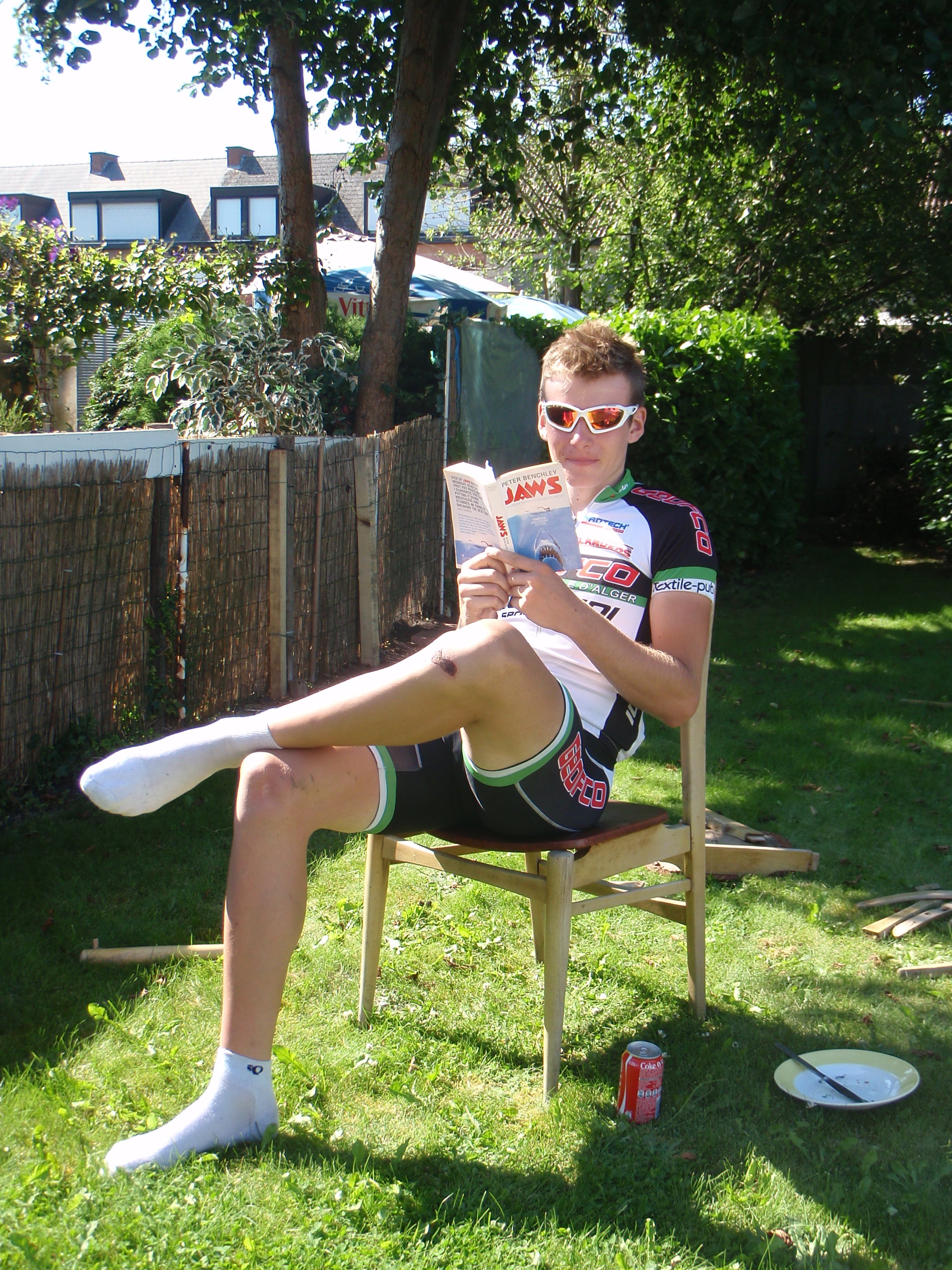 2012. Belgium. Jake Tanner in his Geofco kit pretending to know how to read.