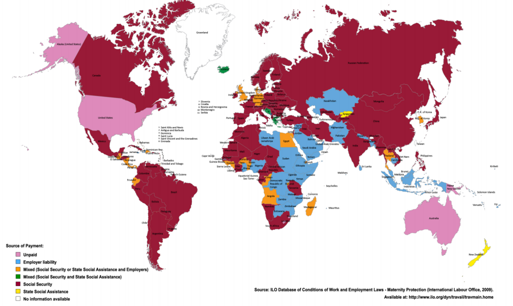 Below is a map of the world’s maternity leave. This map is from 2009, and Australia added paid maternity leave in 2011, so it’s no longer in the pink category with us–the only category that offers nothing.