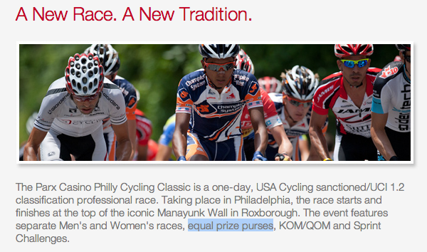 The word equality is more striking than “equal pay,” and cuts directly to what we’re really talking about. In pro, as well as amateur cycling, there’s a sort of debate about whether women deserve equal treatment. This is in regards to prize money, salaries, equal number of races, quality of races, etc. The fact that this ‘debate’ exists has become increasingly disturbing to me. It makes me feel a bit shameful, knowing that so many of my friends and colleagues are, deep down, jaded by bigotry.
