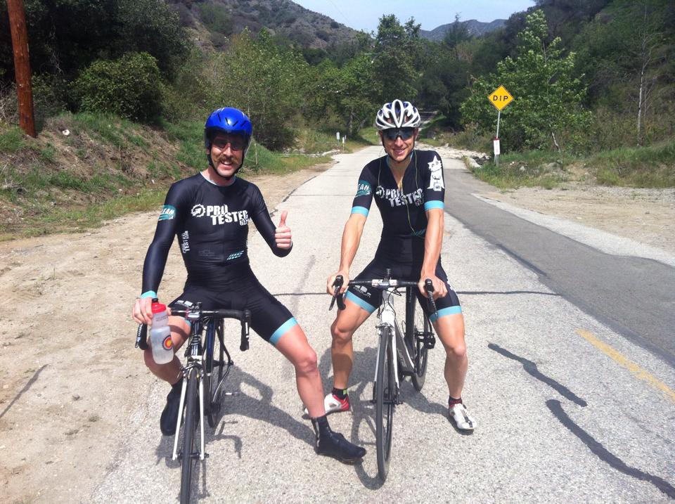 I’m counting on more of these memorable events take place this weekend here at San Dimas. The four-man pack includes Dan Wolf, Tim Rugg, Colin Gibson, and myself. For the last month, Dan and Tim have been on a cross-country journey, hitting up road and mountain bike races along the way from Harrisonburg Virginia to California. Funding has been provided in part by their own wallets as well as an assortment of sponsors back at their home base, including Pro Tested Gear. I got to test out one of the Pro Tested skinsuits in today’s time trial. They’re nearing the end and grand finale of their journey, which includes San Dimas and Redlands to top it off.