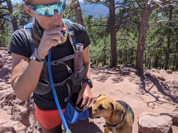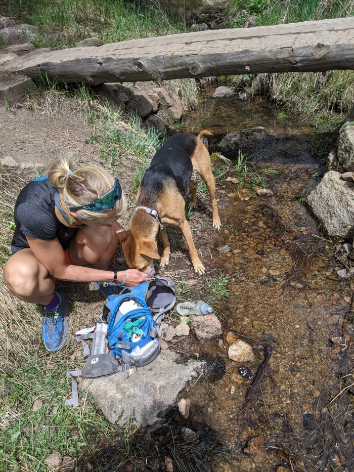 Kibble, doughnuts, Snickers, clif bars, and trail mix. And lots of water stops for the Hound.