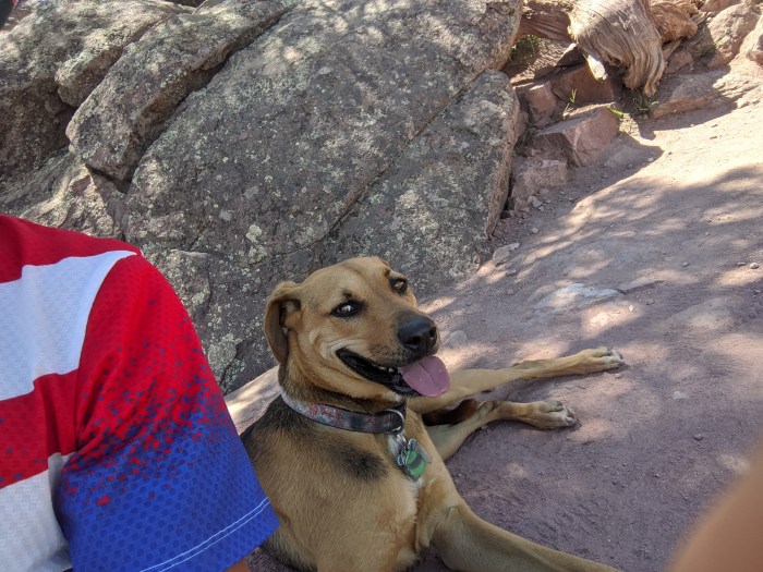 Backside of Sanitas after summiting in the heat of the day. Maybellene was feeling the sun by this point. I believe it got into the upper 80s by the afternoon. We brought five liters of water, but had to refill at Ebin G Fine park earlier. In total, we drank 7 or so liters.