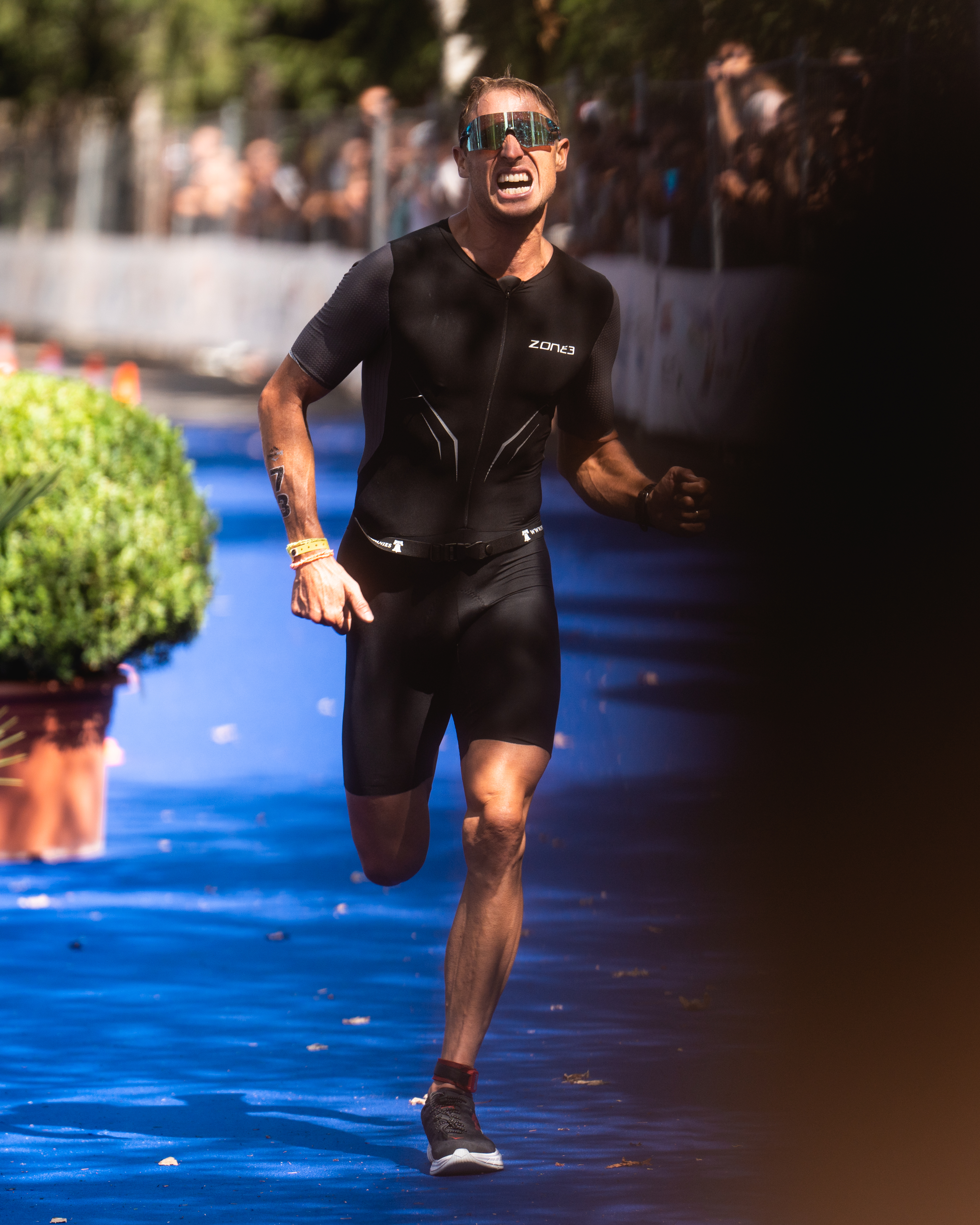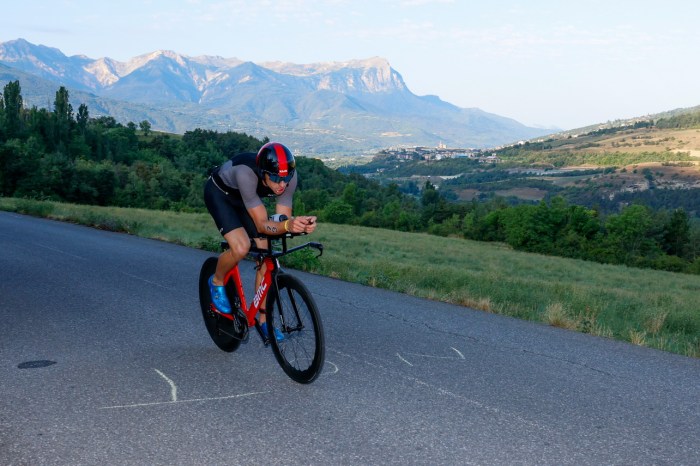 The remaining climbs were long and steep. The roundabouts were incessant. The traffic in the roundabouts was also incessant and I was damned if I was going to slow down for anyone. I made up for the risks I hadn’t taken on the Izoard descent, passing cars on the inside of the roundabouts at times. My stomach was queasy from the high quantity of sugar I’d already consumed. But I had to keep eating. I forced down gummy candies and caffeinated Cliff Bloks. I felt worse and worse, yet the gap somehow remained stagnant at four minutes. While I didn’t think I’d be able to finish the marathon (in fact I knew that I wouldn’t be able to finish it) I vowed to give the remaining bike leg a solid effort, and pray that I wouldn’t get caught by too many guys. Being re-passed on the bike would be pretty damn embarrassing. There must have been a mounting hoard just behind me at that point, I assumed.