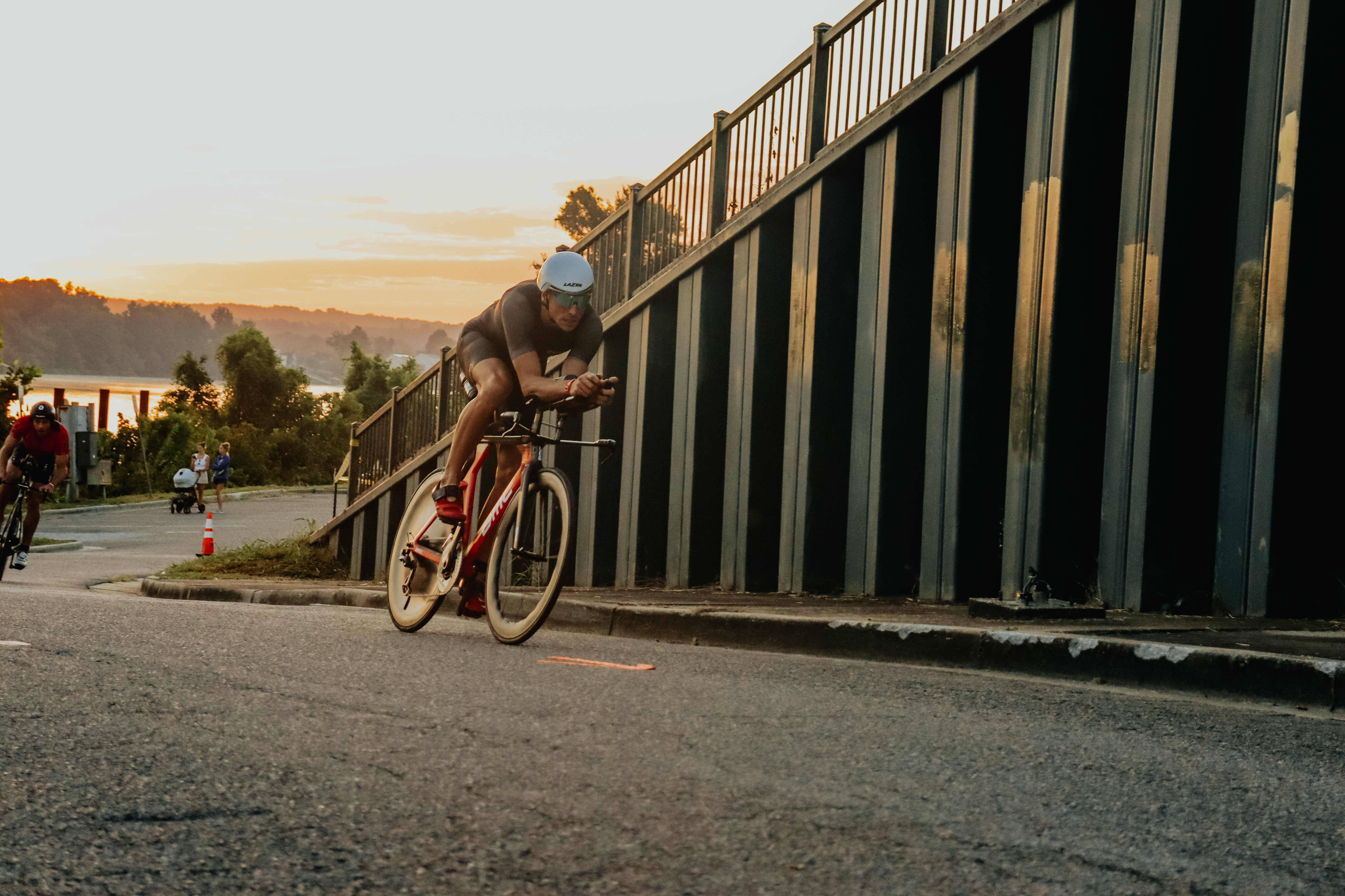 The first descent ensued and I began botching corners left and right, unable to commit to the outside line, which may or may not have contained an oncoming vehicle since the road wasn’t closed. One guy, who had been sticking with me for the past few miles, passed me and was instantly 10 seconds up the road, screaming down the descent. I lost more confidence in my descending when he vanished out of sight. The road became increasingly technical, and turned directly into the rising sun for what must have been four or five miles. I shielded my eyes with one hand off the bars to scan the upcoming turns. By the bottom, the guy who’d passed me was almost a minute up the road, and had connected with another rider for the flat section of the course that followed the lake. In hindsight, I realized that this race attracts good cyclists (obviously), and that my performance on the bike wasn’t quite as bad as I felt like in the moment. However, if I were to do this race again, I’d practice these damn descents.