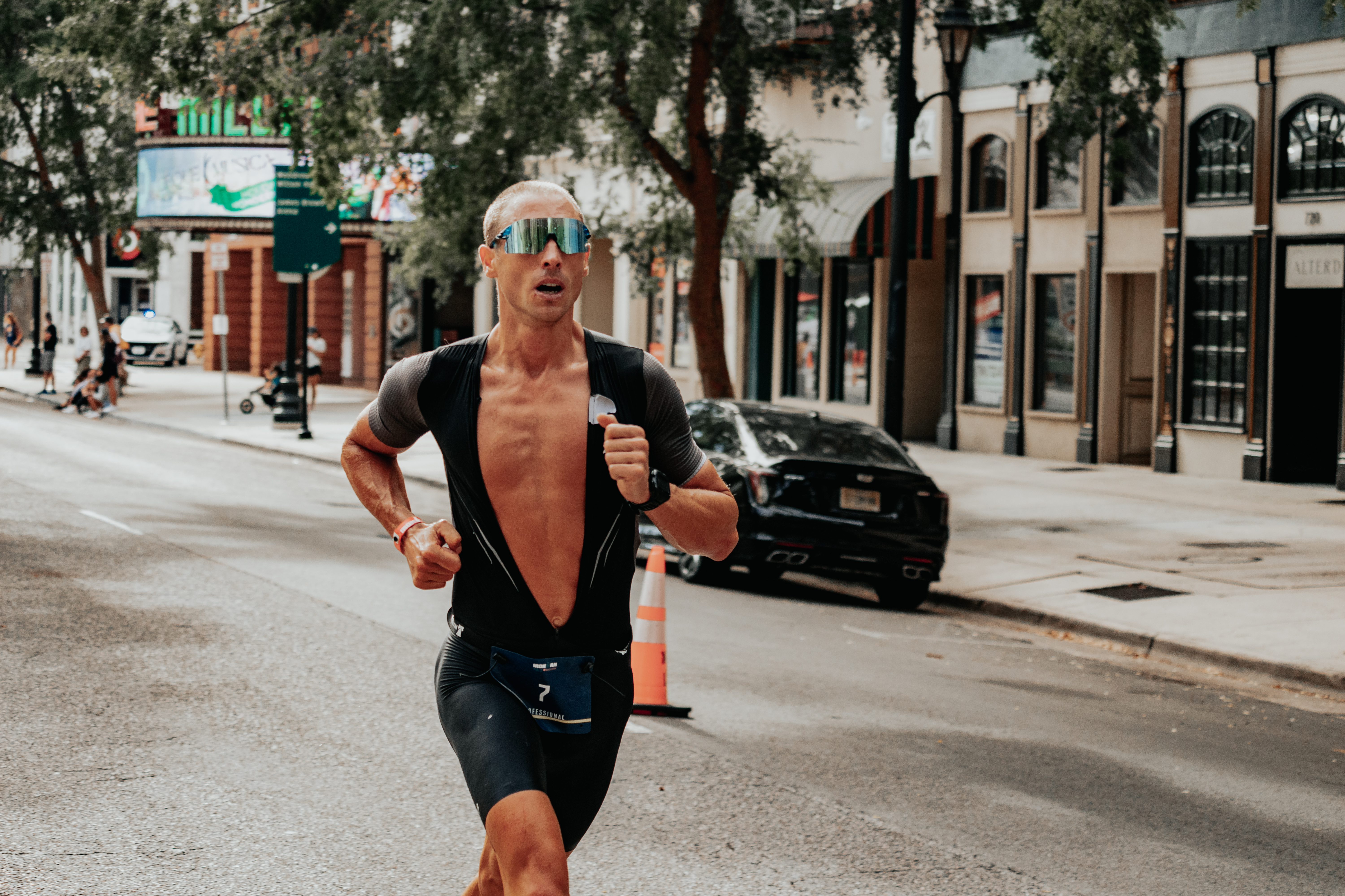 I came out of T2 in third (within our group) and immediately felt the race slipping away from me as a chest cramp burrowed itself deep into my rib cage. I’d forgotten to turn my watch on to find satellites before we got off the bike, so I couldn’t see my pace, which was a good thing because it would have only disheartened me even more. Sam passed me as Joe, Bart, and Jan Van Berkel began disappearing up the road. Miraculously, as we made our way beneath the skyscrapers of downtown, the chest cramp began to fade. I surged back up onto Sam’s heels, passed him, and continued the surge past Jan, Bart, and Joe. I began feeling stronger and stronger, and threw out any previous race plan I had of “just” a top 10. The new plan was to win, or get on the podium, as crazy as that was.