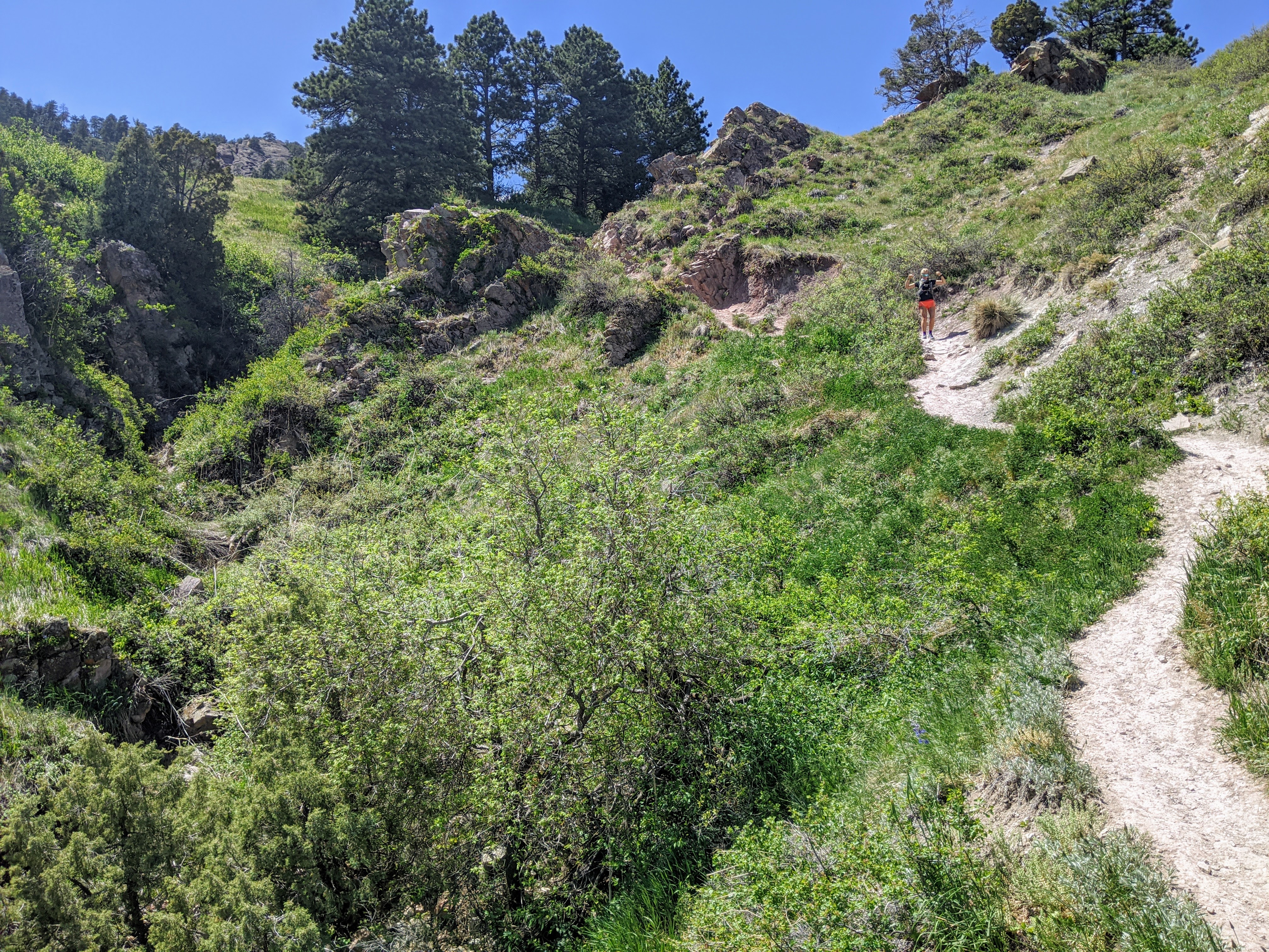 Yesterday Adelaide and I set off to do a Boulder tradition that, somehow neither of us had thought of doing until recently: the Skyline Traverse. It involves hiking and/or running all the major peaks—South Boulder, Bear, Green, Flagstaff, and Sanitas. In total, it was 19.7 miles and 6,000 feet of elevation gain. We drove to south Boulder and were on the trail by 8:00. My guess is that we ran about 7 miles total and hiked the rest. The trails weren’t too crowded and it ended up being a perfect day.