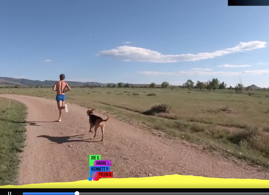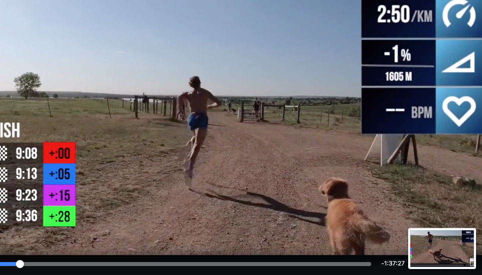 Tyler, Joe, Andre, and myself went head to head (20 minutes apart) out on Eagle Trail on Thursday with a bike-mounted cameraman filming our suffering. Maybellene got loose from Adelaide at the 1K mark and tagged along at my heels for a hundred meters. After getting a slow start in the first half, I picked things up in the second half and threw down a 9:13 while narrowly avoiding a rogue dog attack by our friend’s dog Jack, who came at me from the side like a wolf ripping out the hamstring of a caribou. I kept on my feet and kicked towards the finish.
