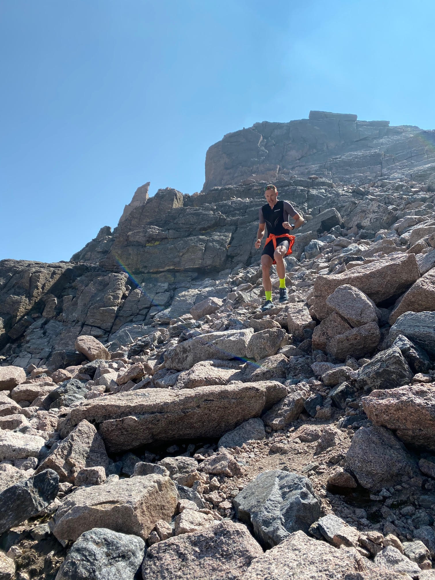 With Covid putting a quick end to the race season this year, I chose to focus on writing a novel or two instead of continuing to train. I did, however, manage to put in eight to 14 hours of training a week, for sanity’s sake, and came up with the goal of setting a new FKT (Fastest Known Time) for the Long’s Peak Duathlon, which involves riding 38 miles from Boulder up to the trailhead at 9.2K feet, summiting and descending Longs Peak (a 14er), and riding back to Boulder. I’d heard of this ‘event’ a number of years ago, and always thought it would be cool to do, but with racing, it just never made sense to attempt it. Now that my first manuscript is mostly completed, though I’m sure it needs a fourth round of editing, I decided to spend the previous couple weeks getting in passable shape to give the Duathlon a shot. I did a few four hour rides a few weeks ago, finally built my A-Squared TT bike up last week, then began scouting Longs for the route I was planning to take (the Cables route, which involves a pitch of class 5 scrambling).